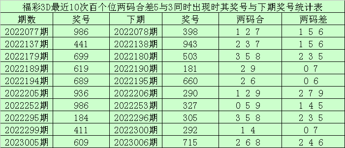 从以上统计不错看出,百个位两码合差5与3同期出现之后其下期两码合差推崇最热的4个区别为:1256,本期百个位两码合差不错参考这四码中的数据。