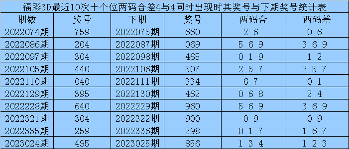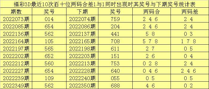 百十位合差分析:上期奖号百十位开出10组合,两码合为1,两码差为1,最近10次百十位两码合1与两码差1同期出当前,其奖号和下期奖号区别为: